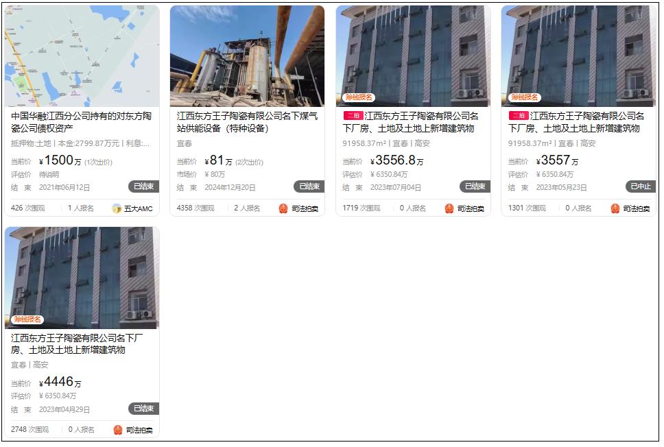 2023年4月29日,“江西东方王子陶瓷有限公司名下厂房、土地及土地上新增建筑物”的标的以评估价6350.84万元, 起拍价4446万元在阿里资产拍卖网上起拍,最终流拍。随后,该标的在2023年5月23日以3557万元的起拍价,2023年7月4日以3556.8万的起拍价分别拍卖,但均流拍。