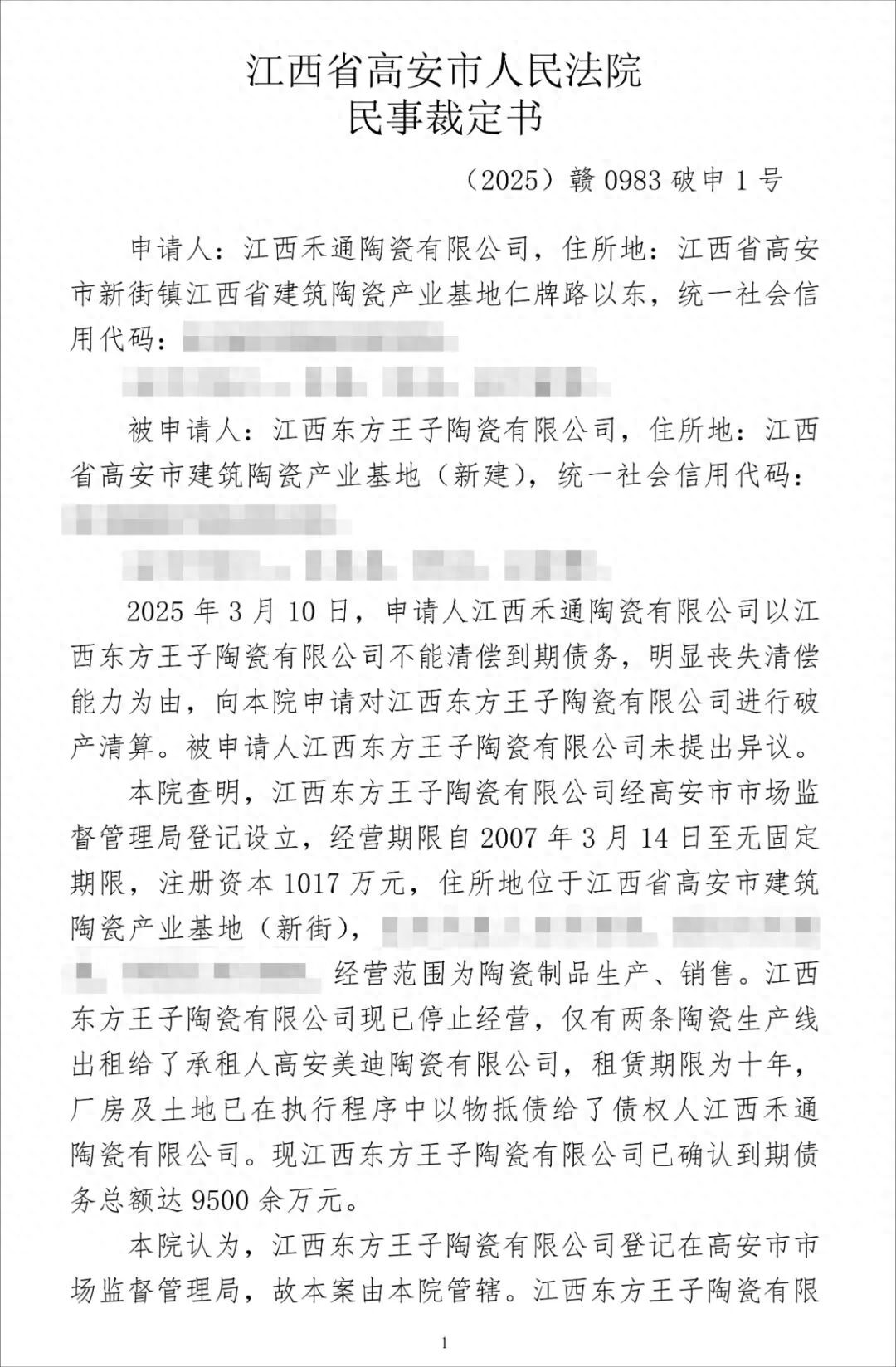 民事裁定书提到,2025年3月10日,申请人江西禾通陶瓷有限公司以江西东方王子陶瓷有限公司不能清偿到期债务,明显丧失清偿能力为由,向江西省高安市人民法院申请对江西东方王子陶瓷有限公司进行破产清算。被申请人江西东方王子陶瓷有限公司未提出异议。
